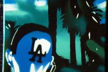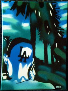 painting of man with l.a. shaved into his hair set on a california palm tree background.