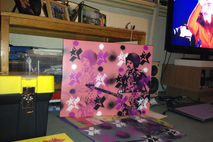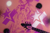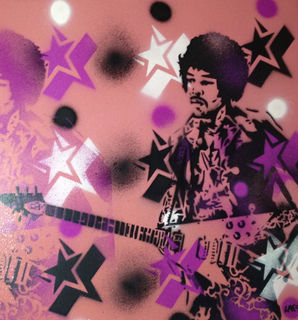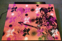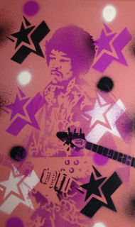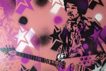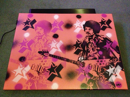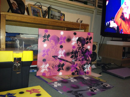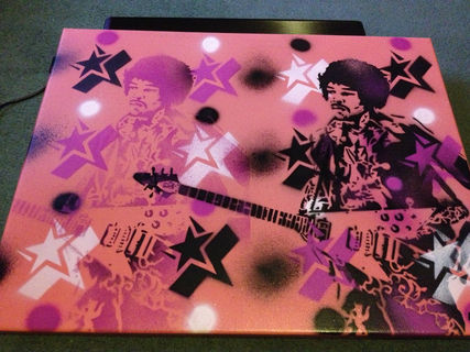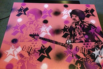 painting of the late great jimi hendrix with his electric guitar,made with handdrawn,handcut stencils and spraypaints.