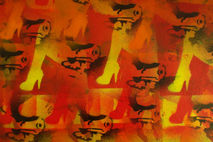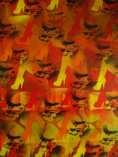 painted using handcut stencils & spraypaints in a warhol style,legs stencil and gun stencil blended together in a warhol print style.