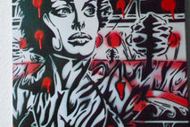painted using handcut stencils and spraypaints,painting of an old illustration titled jolie in the jungle