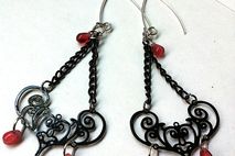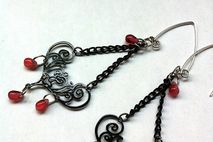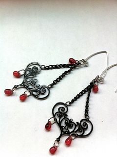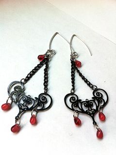 i made these with black chain conneceted to a very thin black laser cut metal filligree finding and then dangled Czech pressed glass in a milky/transparent cranberry marble teardrops!!