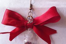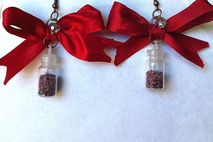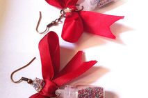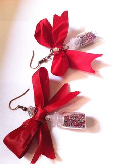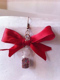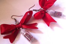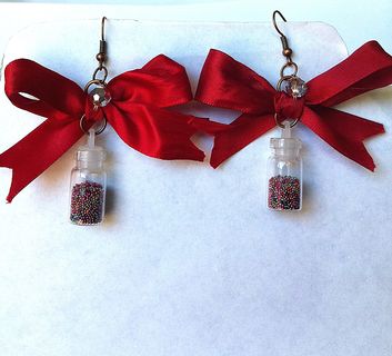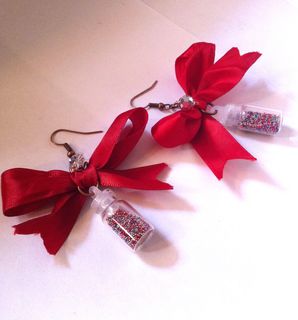Add a little Something different to your wardrobe! With these darling red bows that have a tiny glass bottle filled with Tiny confetti balls)!! I've added a little silver clear disco ball crystal for some sparkle. These bow earrings are 2" in length and almost 2" wide,and I used a bit of jewelry glue to seal the lid of the bottle.