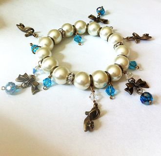 This charm bracelet is made with large glass pearls,rhinestone spacers,Swarovski crystals,metal antiqued gold tone bows and princess shoes(like glass slippers)!! I used peacock blue rondelle crystals,clear and aqua bicones. All on a stretchy cord,so it will fit most wrists. This might be a nice touch for a bride,a cute summer piece,or you can wear it with something fancy or casual!! perfect for young girls,teens,or adults and just in time for christmas!!
