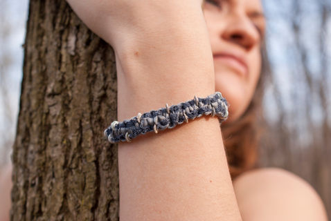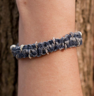 ▽ This bracelet is made of only natural fibres that have been dyed with natural plants to obtain the range of colours. It has various silks, lace, wool and tulle. Silver beading and chain.