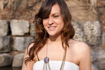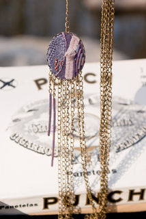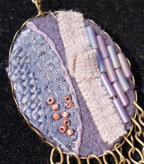 ▽ This pendant is made of only natural fibres that have been dyed with natural plants to obtain the range of colours. It has various silks, lace, wool and tulle. Glass and cooper beading. Bronze chain.