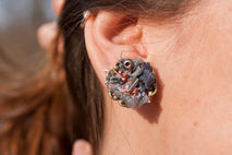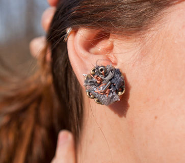 ▽ These earrings are made of only natural fibres that have been dyed with natural plants to obtain the range of colours. It has various silks, lace, wool and tulle. silver beading. Bronze base.