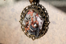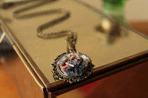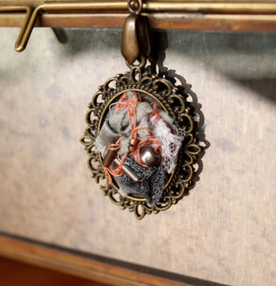 ▽ This pendant is made of only natural fibres that have been dyed with natural plants to obtain the range of colours. It has various silks, lace, wool and tulle. Silver and cooper beading. Bronze chain.