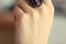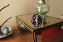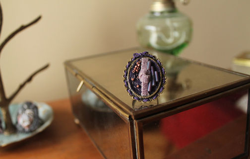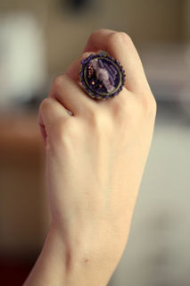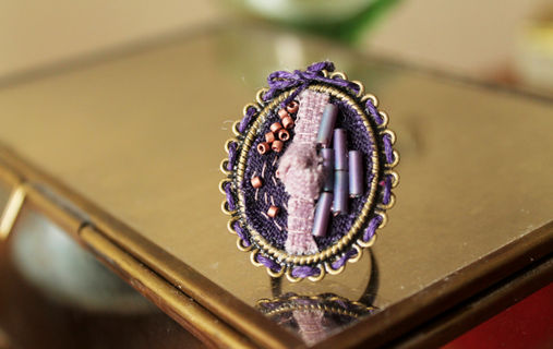 ▽ This ring is made of only natural fibres that have been dyed with natural plants to obtain the range of colours. It has various silks, lace, wool and tulle. Silver and cooper beading.