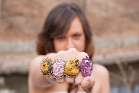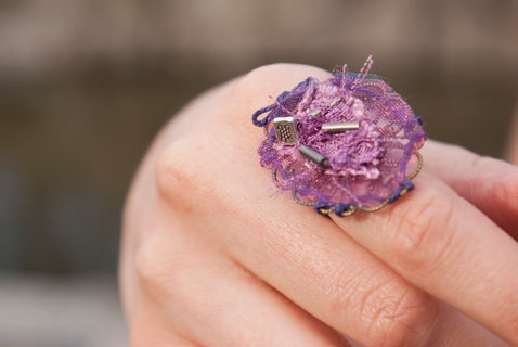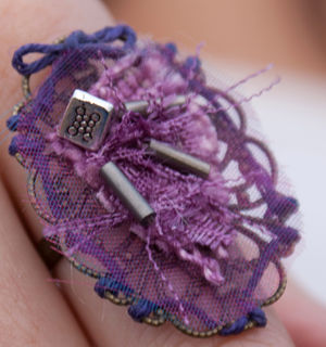 ▽ This ring is made of only natural fibres that have been dyed with natural plants to obtain the range of colours. It has various silks, lace, wool and tulle. Silver and cooper beading.