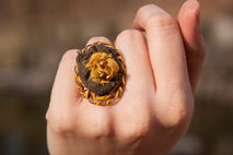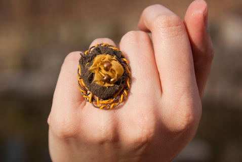 ▽ This ring is made of only natural fibres that have been dyed with natural plants to obtain the range of colours. It has various silks, lace, wool and tulle. Multicolour beading.