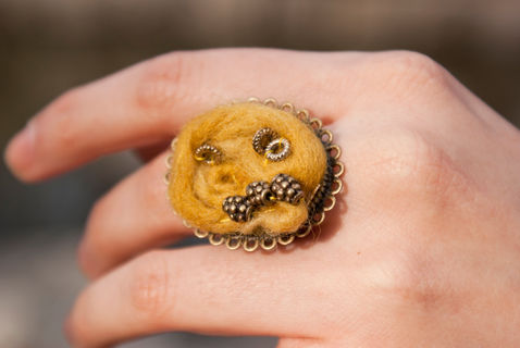 ▽ This ring is made of only natural fibres that have been dyed with natural plants to obtain the range of colours. It has various silks, lace, wool and tulle. Bronze beading.