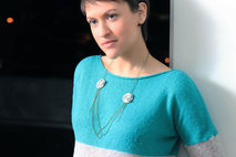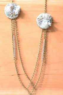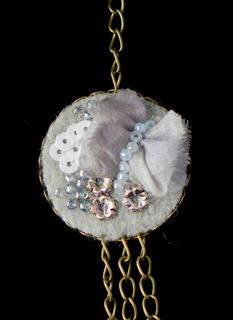 ▽ This pendant is made of only natural fibres that have been dyed with natural plants to obtain the range of colours. It has various silks, lace, wool and tulle. Glass and silver beading. Bronze chain.