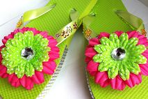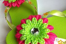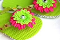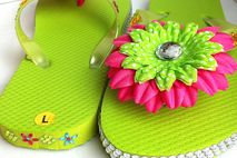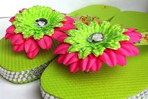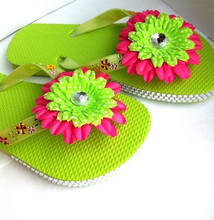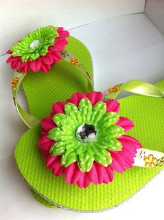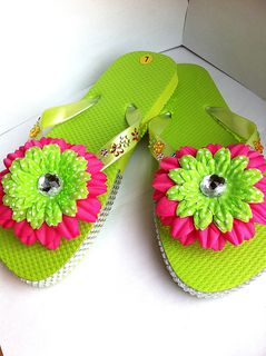 these cute embellished rubber/foam flip flops are hand decorated by me with lots of rhinestones in clear and multicolored flowers,a green and hot pink flower with a large rhinestone on top. these flip flops are perfect for spring,summer,easter,heading to the beach,or for any occasion! dont want to get these beauties dirty? then you can wear them inside as slippers or houseshoes,or make a "mom and me" date to the salon and wear them as spa slippers! this pair is size LARGE (US 13/1),depending on foot size they would be good for a 10-12yr old.