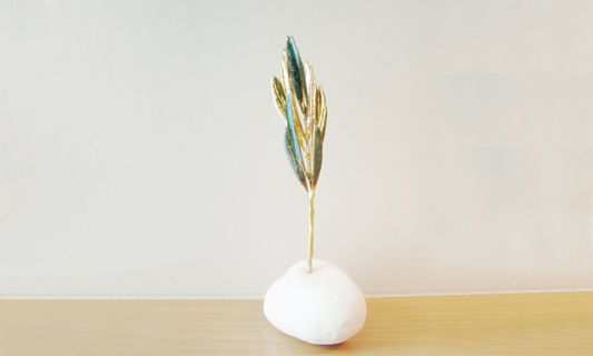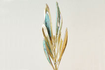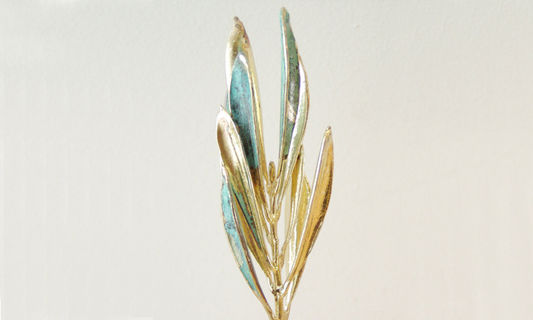 Real olive branch, copper and gold plated by electroplating. A small sculpture straight out of the vast, Greek olive groves.