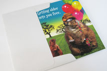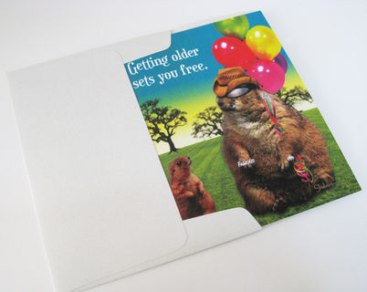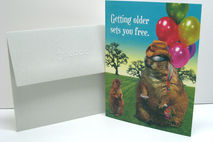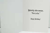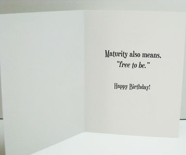 Inside of card reads: MATURITY ALSO MEANS, “FREE TO BE.” HAPPY BIRTHDAY