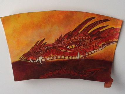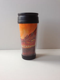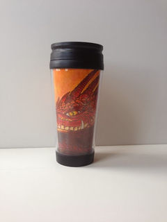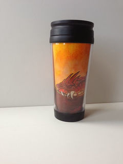 This intricately handpainted travel cup features Smaug the Dragon from the Hobbit and Lord of the Rings. Smaug is depicted in close up, with his face in great detail. and the last end of his tail wrapped below him. The background is heavily textured to give a fiery feel.