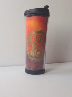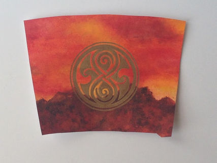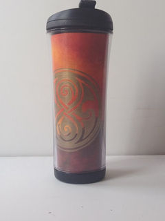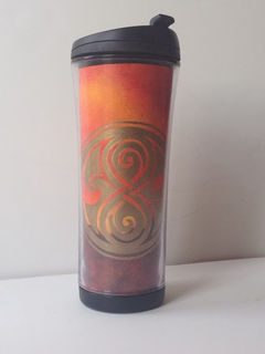 This hand painted travel cup features the Gallifrey landscape in fiery reds and oranges. The official symbol of Gallifrey is done in gold.