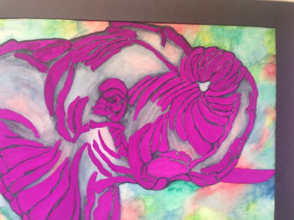 This hand-painted piece features a beautiful African elephant highlighted in purple on a watercolor background!