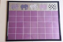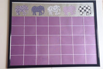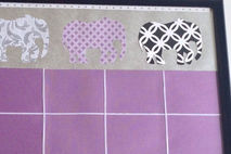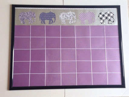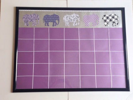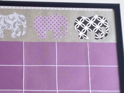 Handmade dry erase calendar featuring patterned elephants on a silver and purple background. Fun way to organize in style!