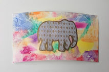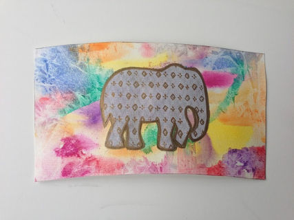 This hand painted coffee cup features a textured, multicolored background of high-quality watercolor paper. The elephant on top is highlighted in bronze with the diamond pattern accented.