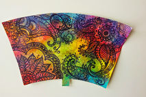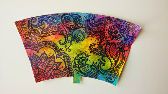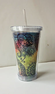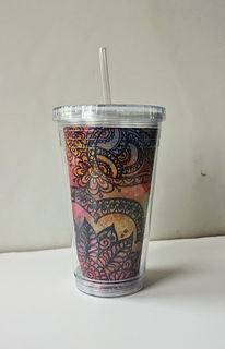 This hand painted coffee cup features a pearlized paper with multicolor accents. A very intricate henna pattern is hand painted all over. The pearl paper gives a subtle, elegant sheen when it hits the light.
