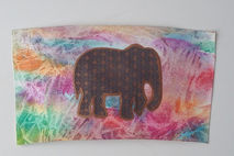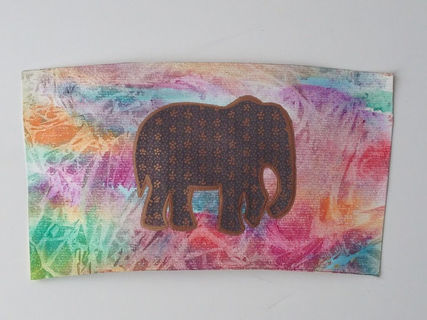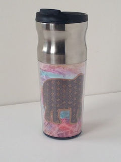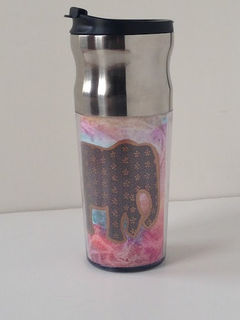 This hand painted coffee cup features a textured, multicolored background of high-quality watercolor paper. The elephant on top is highlighted in bronze with the floral pattern accented.