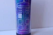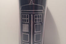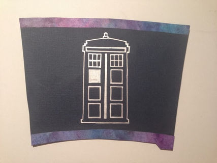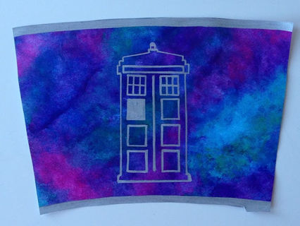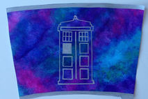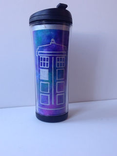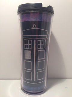 This hand painted coffee cup features the TARDIS in silver. Two background options! Either textured navy cardstock with a galaxy border, or a galaxy scene with a silver border.