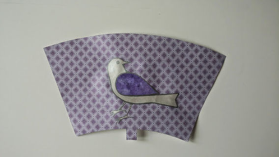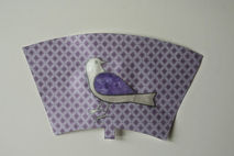 This hand painted coffee cup features a patterned purple diamond background with a silver bird silhouette. Marbled wings on the bird give a sheen to this pretty design!