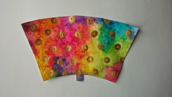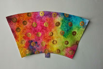 This hand painted coffee cup features a hand painted background of blues, purples, pinks and greens with gold accent polka dots. Great abstract pattern with the right amount of shine!