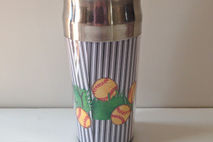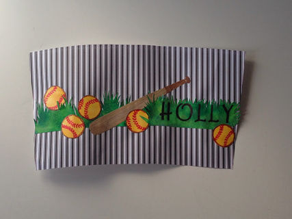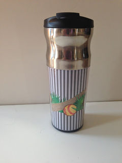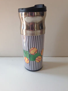 This hand painted coffee cup features pearlized yellow softballs with red stitching and a baseball bat of textured wood cardstock, all on a green grassy border. The black and white geometric background provides a great contrast.