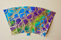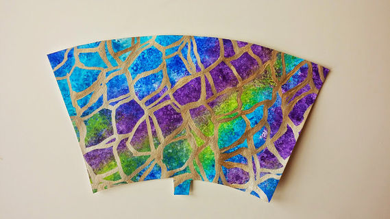 This hand painted coffee cup features a hand painted background of blues, purples and greens with gold accent lines. Great abstract pattern with the right amount of shine!