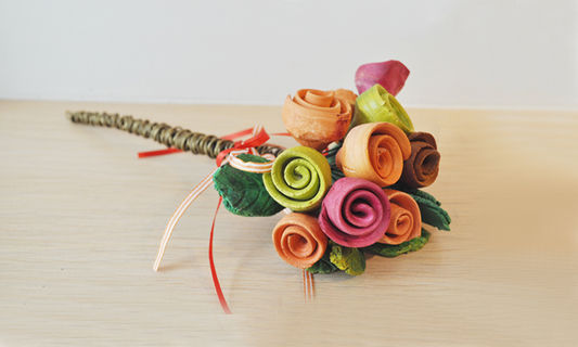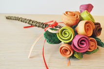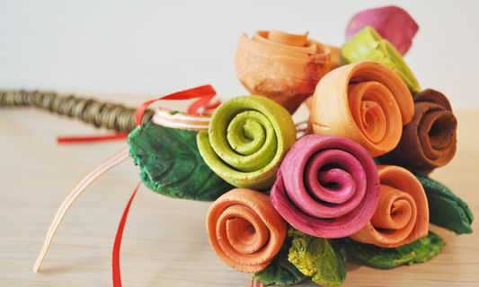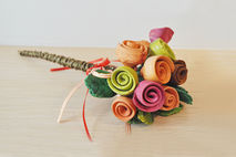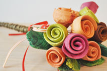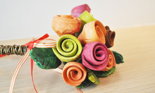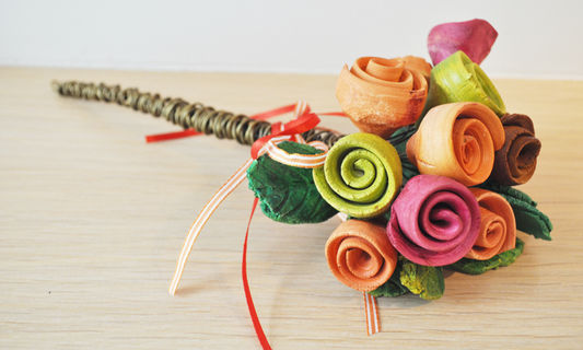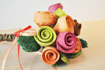 The roses are made of earthenware clay and are all tied together with oxidized, brass wire and colourful ribbons. The colours may vary each time.