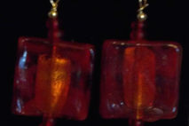 Fire red 3/4 inch square earrings with golden highlights buried deep inside the glass; total length from top of gold plated french hooks to bottom of red E beads is 2 1/8 inches.