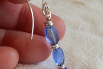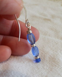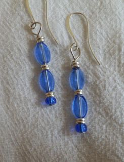 Flat translucent 3/8" blue beads with sterling silver spacers; total length from top of sterling silver french hook is 2 inches.
