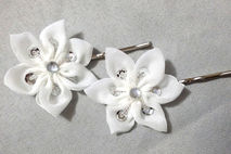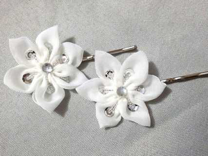 Silk floral wedding hair pins made from silk chiffon, and measure about 1.5" across. Attached to silver colored hair pins.