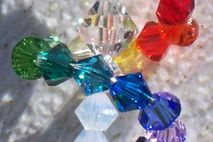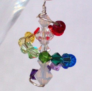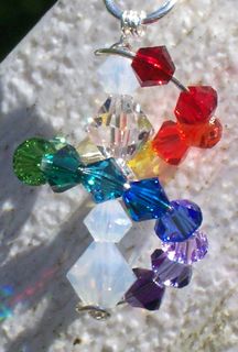 Its fade is the full spectrum of a rainbow: Siam, Light Siam, Indian Red, Hyacinth, Light Topaz, Jonquil, Chrysolite, Peridot, Fern Green, Emerald, Indocolite, Capri Blue, Sapphire, Violet, Tanzanite, and Purple Velvet 4mm Swarovski Crystal** Bicones twist around a core of Clear and Opal 4mm and 6mm Bicones.