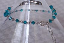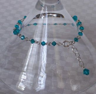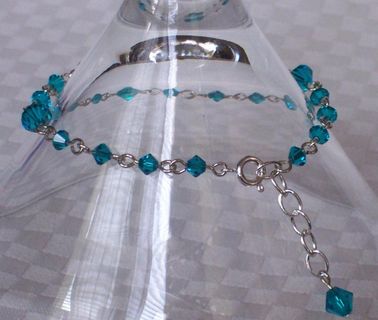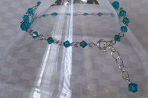 This bracelet shows off the December Birthstone (Blue Zircon) in an elegant but simple way featuring Swarovski Crystal bicones strung on silver-plated wire.
