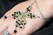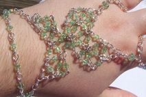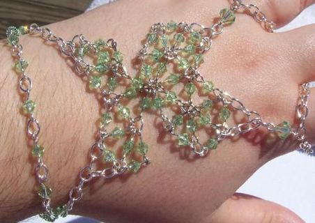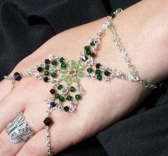 This Swarovski Crystal** and plated silver wire* hand-flower (otherwise known as a "Slave Bracelet"), is a variation on many common designs often seen in Chain Mail. It takes a basic bracelet a step further, and calls attention to the elegance of the hand itself.