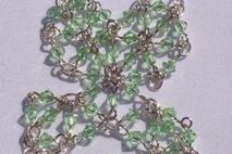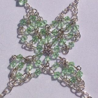 The second photo is of a butterfly made for my niece, part of a set of jewelry made for her prom night. It is a fade of Swarovski 4mm Bicones in Jet (black), Emerald and Peridot, with Chrysolite and Opal added on the wrist, and 6mm Jet (black) near the finger-loops.
