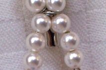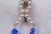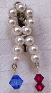 White Swarovski Pearls create the ribbon, strung on Sterling Silver Wire. For those who wish to personalize, as shown, a 6mm Swarovski Crystal** bicone hangs on the left side, to honor the patient, survivor, or the memory of a loved one. On the right, two 4mm Swarovski Crystal** bicones personalize the pin to the wearer. The ribbons are attached to silver-tone bar pins with silver tone craft wire. The craft wire can be substituted for Sterling Silver, but will increase the price nominally.