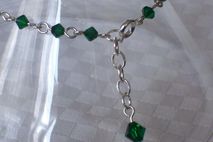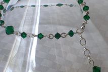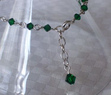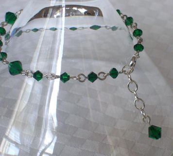 This bracelet shows off the May Birthstone (Emerald) in an elegant but simple way featuring Swarovski Crystal bicones strung on silver-plated wire.