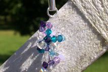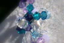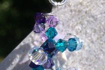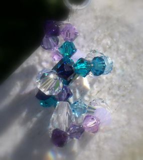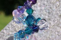Its fade goes from violet to blue and back, weaving darks and lights with clear to accent. Purple Velvet, Tanzanite, Violet, Violet Opal, Aquamarine, Indicolite, Blue Zircon and Dark Indigo 4mm Swarovski Crystal** Bicones, accented with 6mm Clear Swarovski Crystal** Bicones dance and swirl around a core drop of 4mm Violet, 4mm Blue Zircon, 6mm Indicolite, 4mm Tanzanite and a clear teardrop.