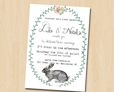 Vintage Rabbit, Whimsical Event invitation. Sweet yet simple design, perfect for bithdays, weddings or baby showers or birth annoucement.