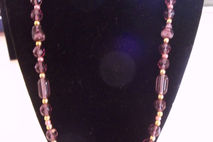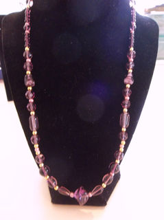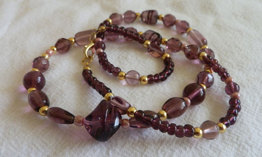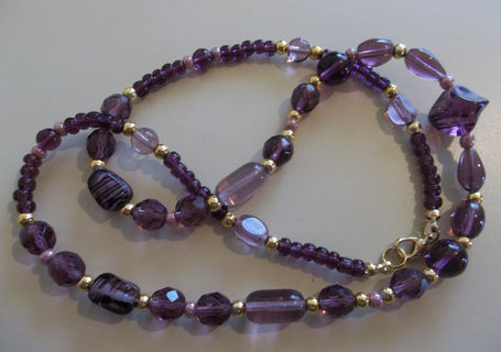 This single strand necklace is approximately 22 inches long, and contains a variety of purple-hued glass and gold beads; large center bead is about 1/4 inch long.