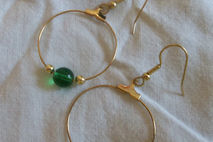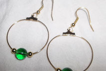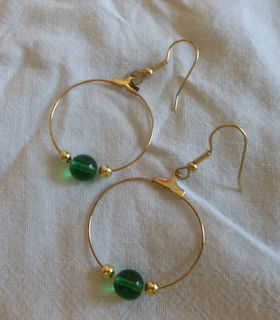 Hoops are 1 1/4 inches across with 1/4 inch green beads and tiny gold beads; total length from top of french hook is 2 1/4 inches.