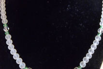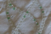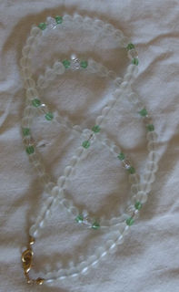 This 24 inch necklace contains frosted glass spaced with clear crystal beads and tiny green swarovski crystals; closed with a lobster clasp.