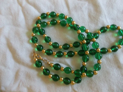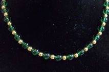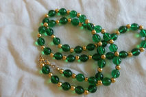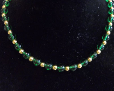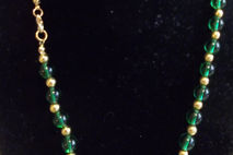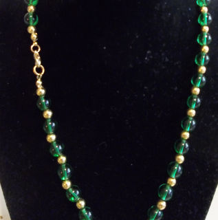 This 24 inch necklace contains quarter-inch green glass beads separated by tiny gold beads, and closed with a lobster clasp.