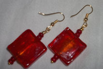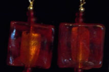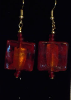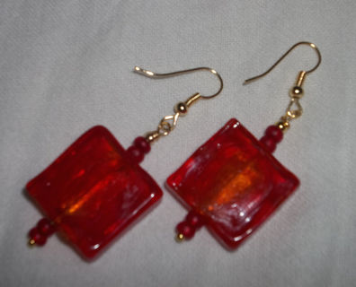 Fire red 3/4 inch square earrings with golden highlights buried deep inside the glass; total length from top of gold plated french hooks to bottom of red E beads is 2 1/8 inches.