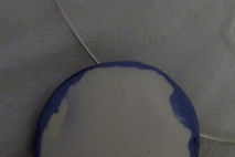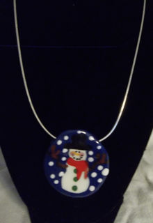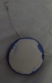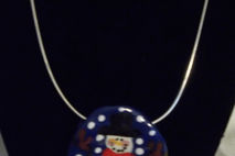 Fun ceramic painted disc is 1.75 inches wide and .25 inch thick, hanging on a 17 inch sterling silver choker chain. (painted details are sharper than shown in photo)