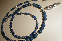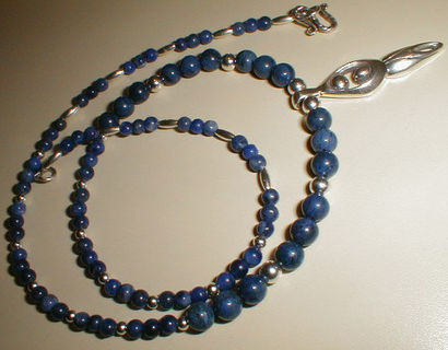 The true blue of sodalite soothes and heals damage from stress, anger, or fear. It can help you think more clearly and calmly. This unique necklace is graced with a sterling silver goddess pendant (approximately 1 1/2" long) and the gemstones are accented by sterling silver beads. It closes with a sterling silver S type hook; approximate length of the necklace is 20 3/4."